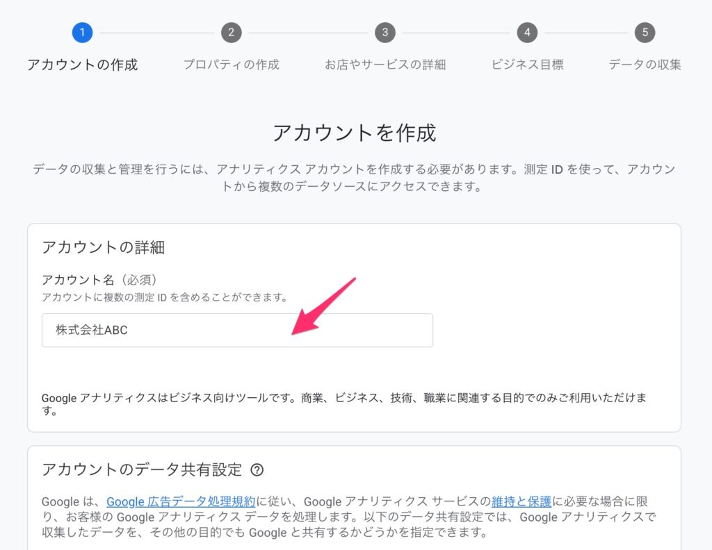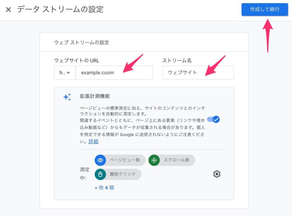 「作成して続行」をクリックしてアナリティクス側の基本的な設定は完了です。