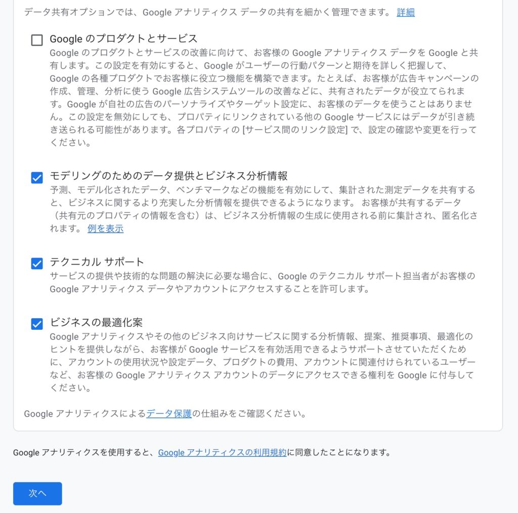 続けて「アカウントのデータ共有設定」の必要な項目にチェックを入れて「次へ」をクリックします。