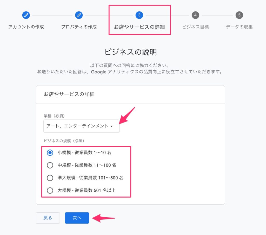 次にお店やサービスの詳細設定です。ここでは、業種とビジネスの規模を選択します。