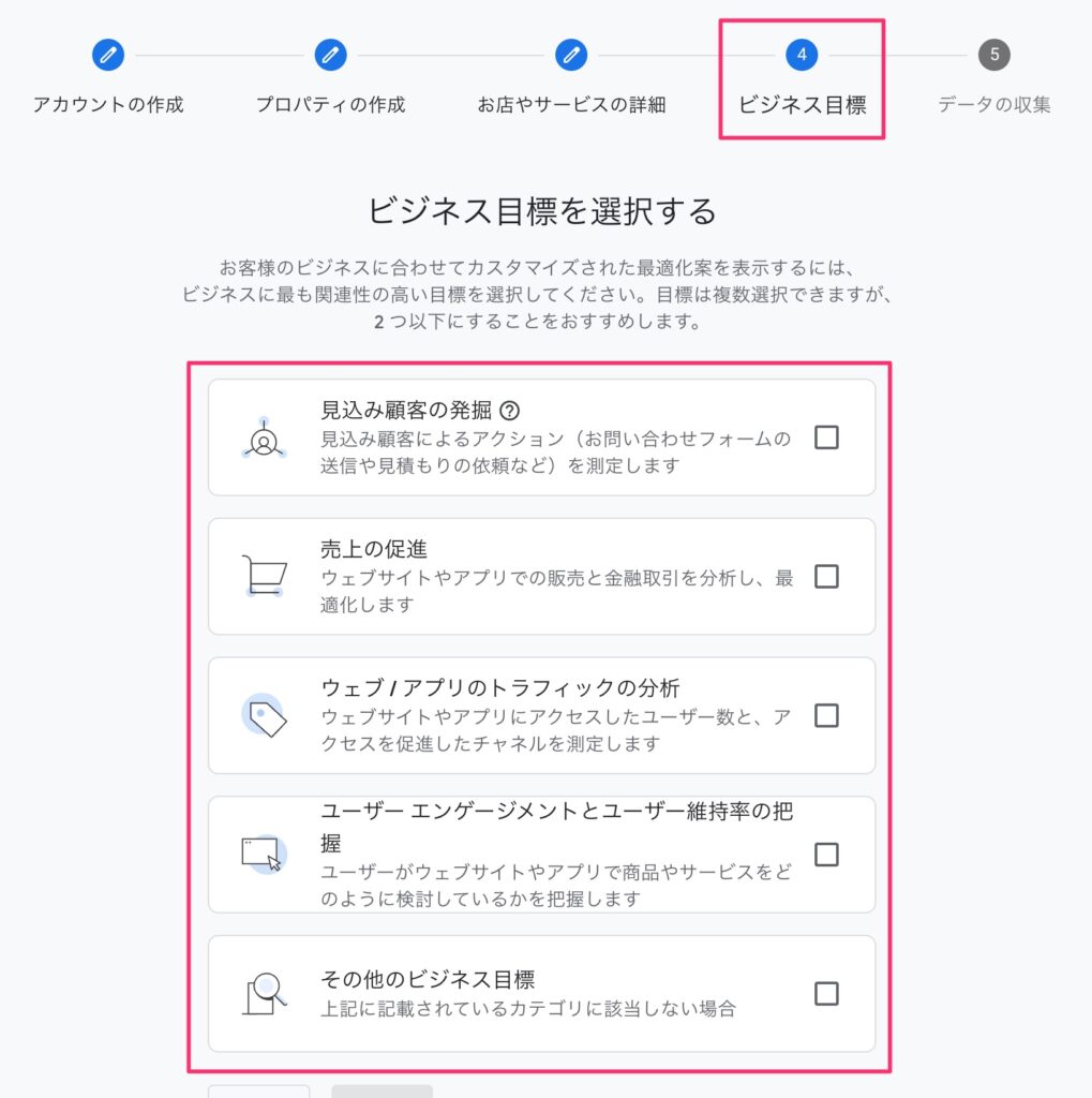 次にビジネス目標を設定します。目的に沿ったものを選択します。