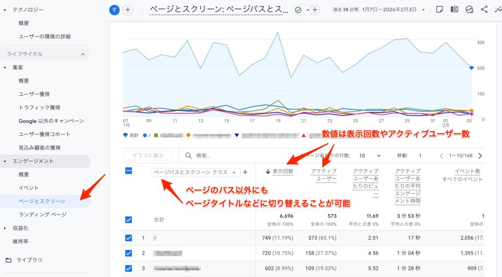 「ページとスクリーン」では、サイトのどのページにアクセスしたかを確認することができます。ページ単位で「表示回数」と「アクティブユーザー」を分析できます。アクティブユーザーというのは、サイトを利用したユニークユーザー数です。