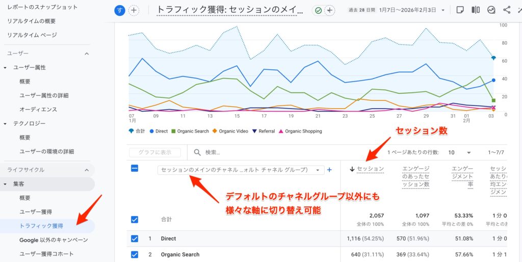 「トラフィック獲得」では、ユーザーがどのチャネルからサイトに訪問したかを分析できます。チャネルというのは、ルールに基づいて分類された流入元のことで、例えば、Direct(ブックマークやURL直打ちなど)、Organic Search(検索エンジンからの流入)などがあります。