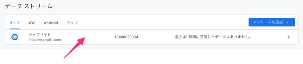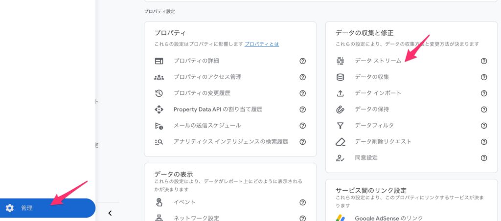 実際に計測するにはアナリティクスのタグをWebサイトに埋め込むために、HTMLファイルを編集する必要があります。HTMLファイルの編集については割愛しますが、ここでは埋め込むタグの取得方法を説明します。下図の「管理」→「データストリーム」に遷移します。