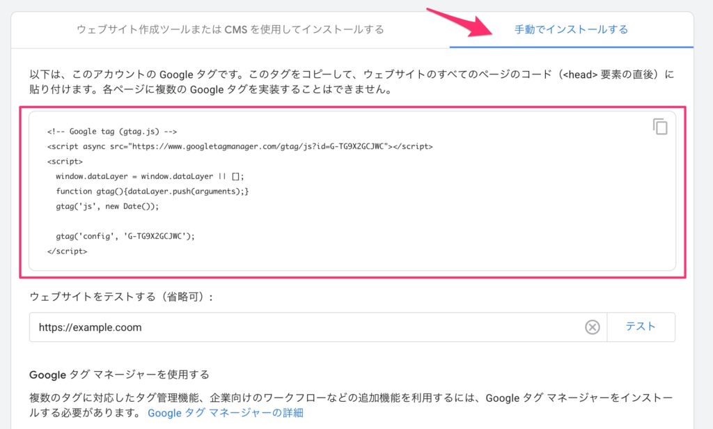 手動でインストールのタブを選択するとタグが表示されますのでコピーしてWebサイトに埋め込みます。
