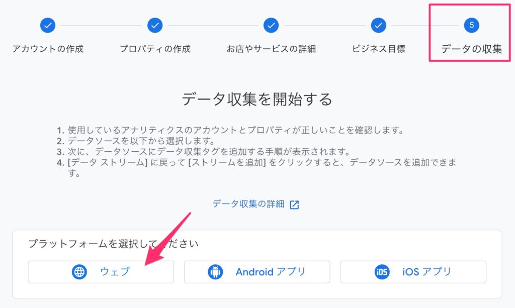 最後に「データの収集」の項目です、Webサイトであれば「ウェブ」を選択します。