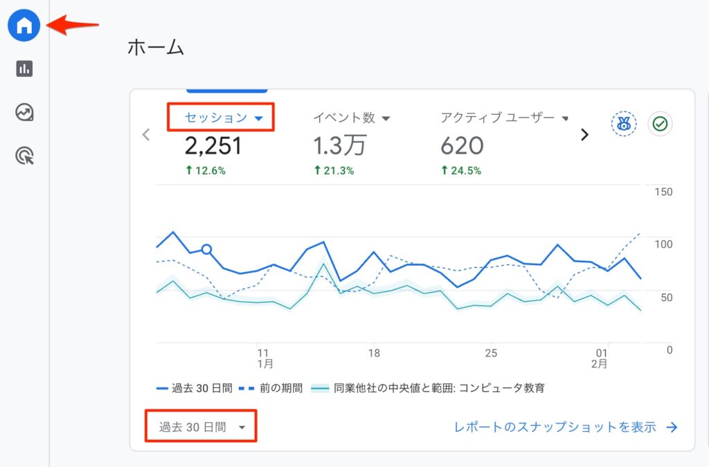 「ホーム」は主要なデータを簡単に確認することができる画面です。細かい分析というよりは指定した期間のセッション数の推移などを簡単に見ることができます。下図の赤枠部分にあるように、デフォルトでは「セッション」の推移を見ることができますが、赤枠部分をクリックして任意のデータに切り替えることができます。期間の指定はグラフの下にある期間が表示されているボックス(下図では過去30日間)から変更可能です。