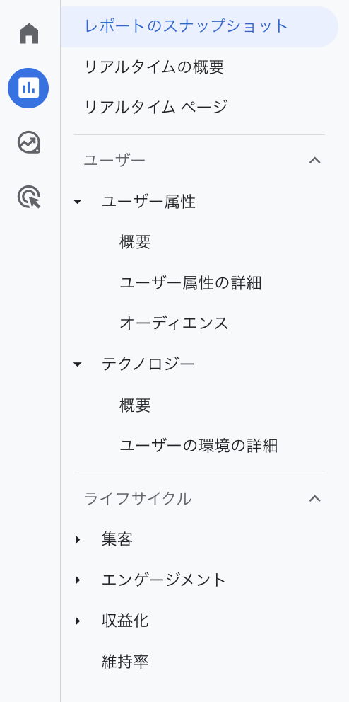 選択するものによってレポートに表示されるメニューの構成(下図)が少し変わってきます。いくつか比較して見てみましたが、メニュー構成の見た目が変わりますが、確認できるデータは大きく変わらないように見えます。