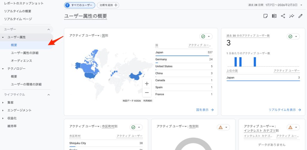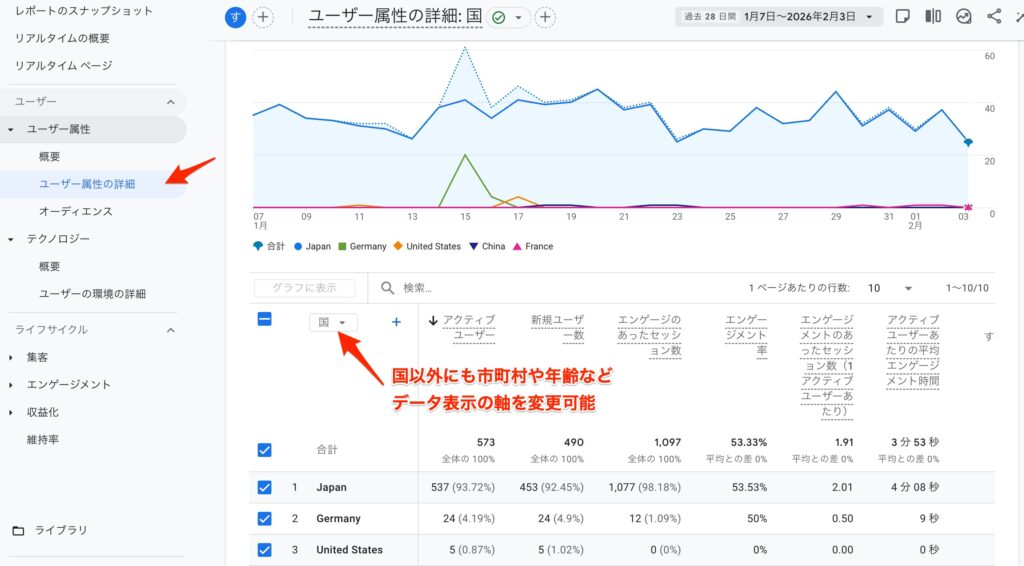 詳細を確認するには、「ユーザー属性の詳細」を見ます。ここでは、ユーザーの属性別のグラフを表示します。デフォルトでは「国」になっていますが、市区町村やデータがあれば年齢に切り替え可能です。