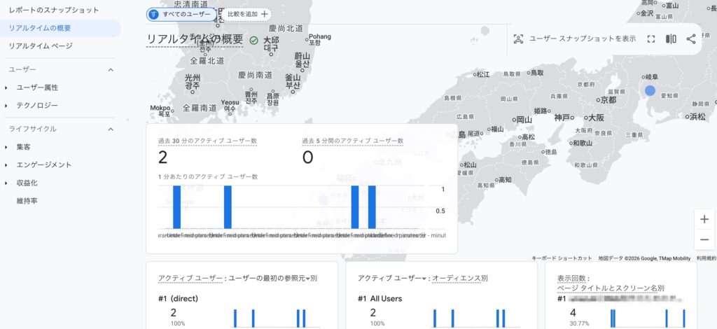 「リアルタイムの概要」をクリックして画面を表示します。ここでは過去30分と過去5分のアクティブユーザーの数を確認することができます。この画面はじっくり見ることは少ないかもしれませんが、テレビやラジオ、SNSなどメディアへの一時的な露出がある場合に、アクセスへの影響をリアルタイムで確認することができます。