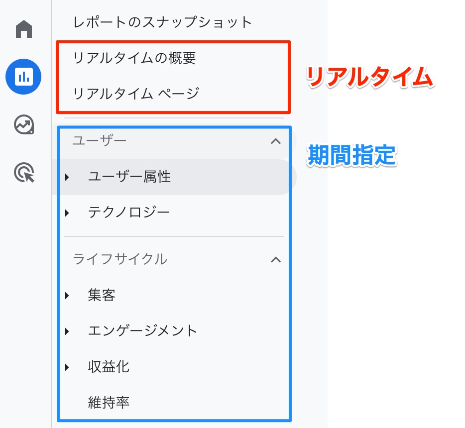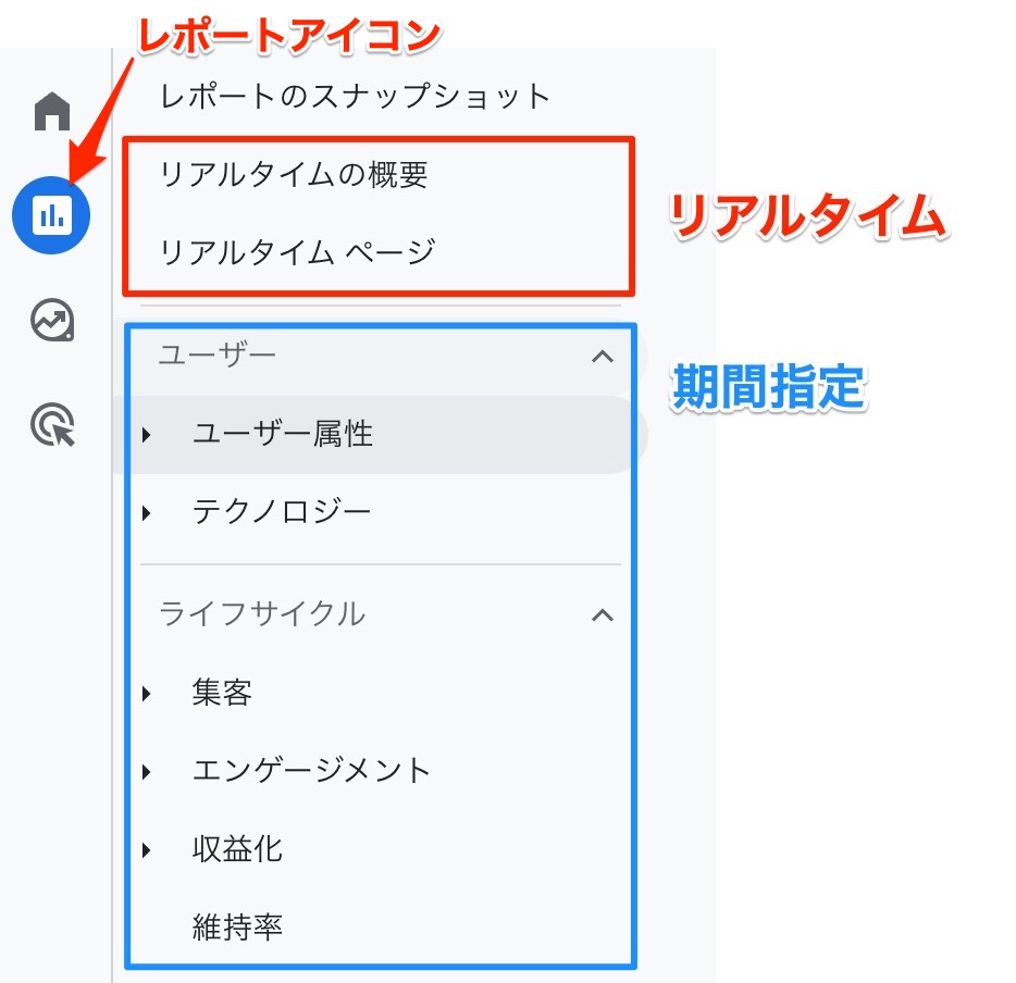 ホームアイコンの次にあるレポートアイコンをクリックすると、レポート画面を開くことができます。アナリティクスのレポートでは、リアルタイムのレポートと指定した期間のレポートを見ることができます。まずは下図の赤で示したリアルタイムのレポートを見ていきましょう。