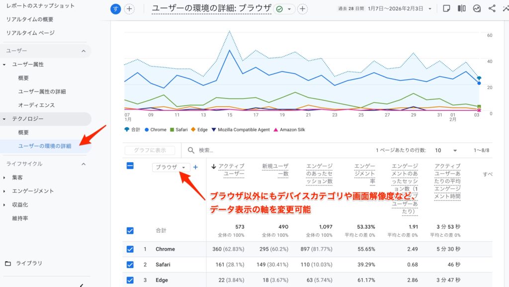 「ユーザーの環境の詳細」では、ユーザーが使っているブラウザやデバイスカテゴリ(PC/スマホ/タブレットなど)を軸にデータの表示を切り替えることができます。