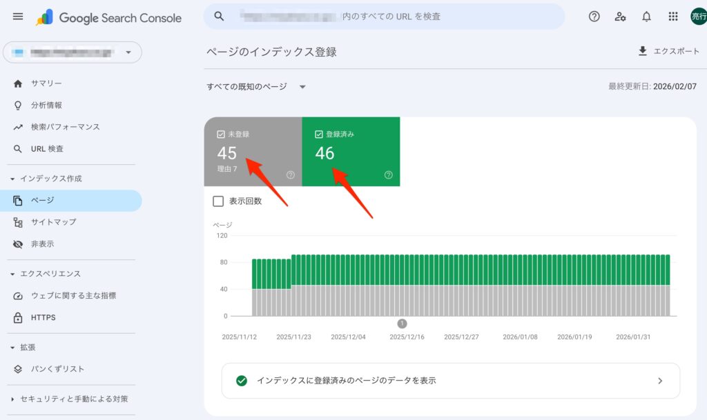 左サイドバーの「ページ」ではページのインデックス状況やエラー内容について確認することができます。下図ではインデックス未登録が45件、登録済が46件であることがわかります。