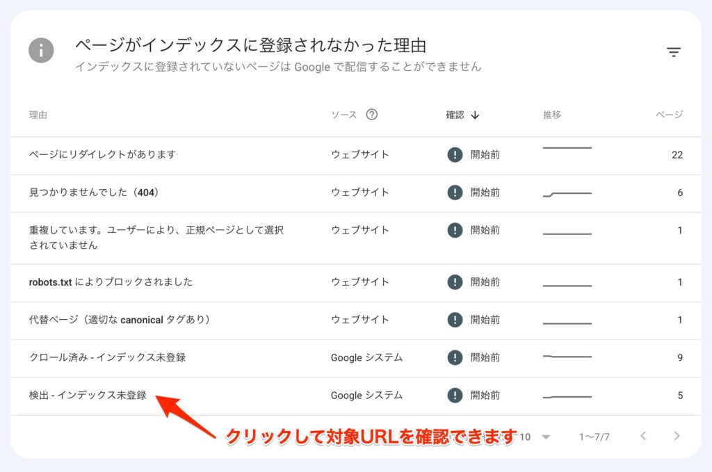 インデックス未登録の理由はその下に原因ごとに一覧になっています。解決しなければならないものとそうでないものがあります。各項目はクリックしてインデックスされなかったURLリストを見ることができますので、気になる部分を確認していきましょう。