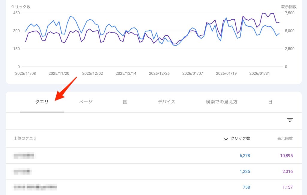 グラフの下にある各タブでクエリ(検索ワード)やページ別等のクリック数や表示回数の詳細を確認することができます。