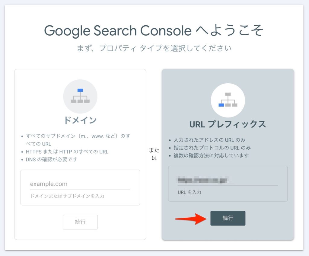 サーチコンソールを導入するにあたり、「ドメイン」か「URLプレフィックス」いずれかの方法でサイトとサーチコンソールを連携する必要があります。ドメインは専門的な作業が必要になりますので、URLプレフィックスを選択し、該当URLを入力しましょう(一般的にはサイトのトップページです)。