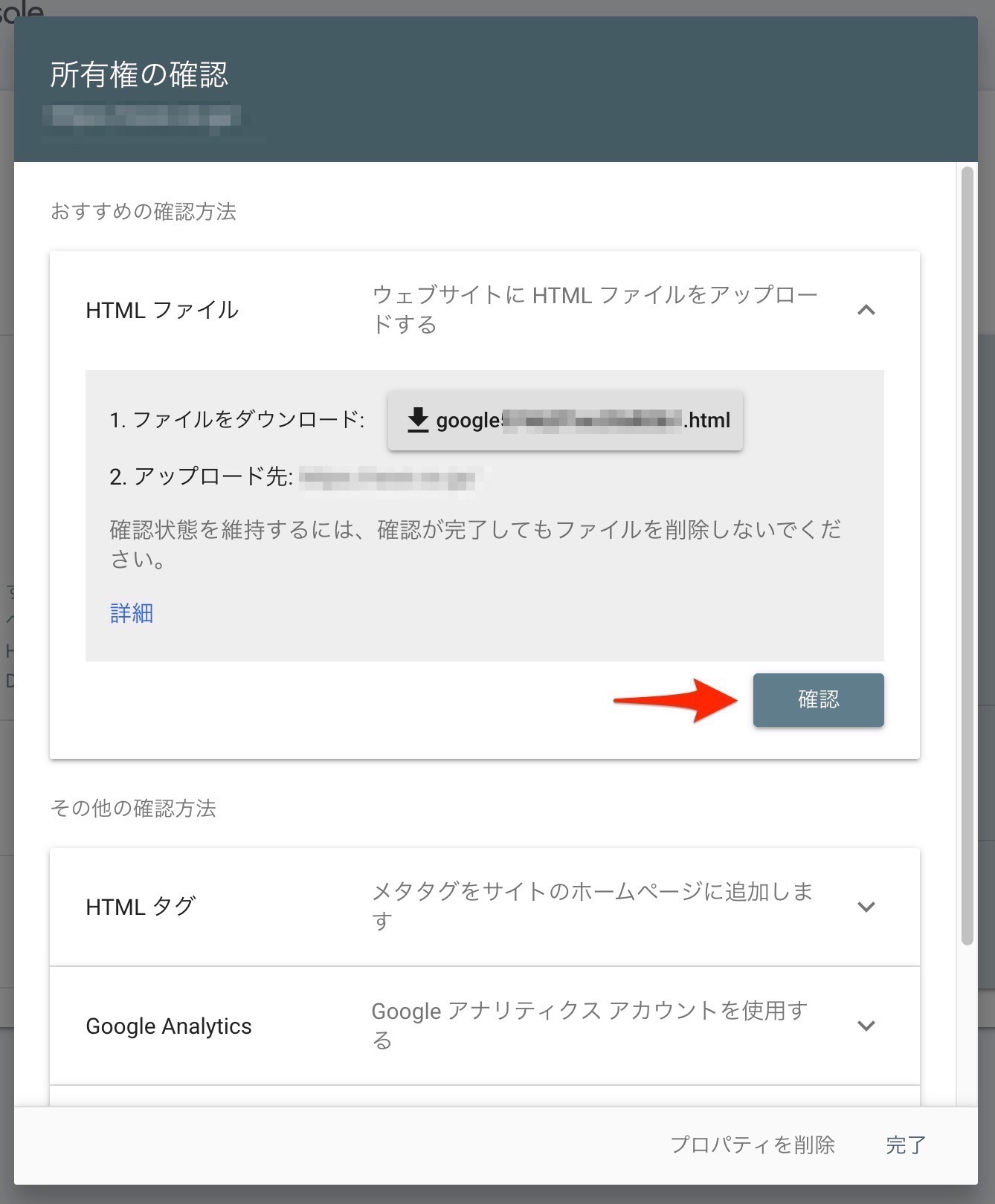 所有権確認用のファイルがダウンロードできますので、ファイルをダウンロードします。ダウンロードしたファイルをアップロード先にアップします。(アップロード先は前画面で自分が指定したURLになっています)