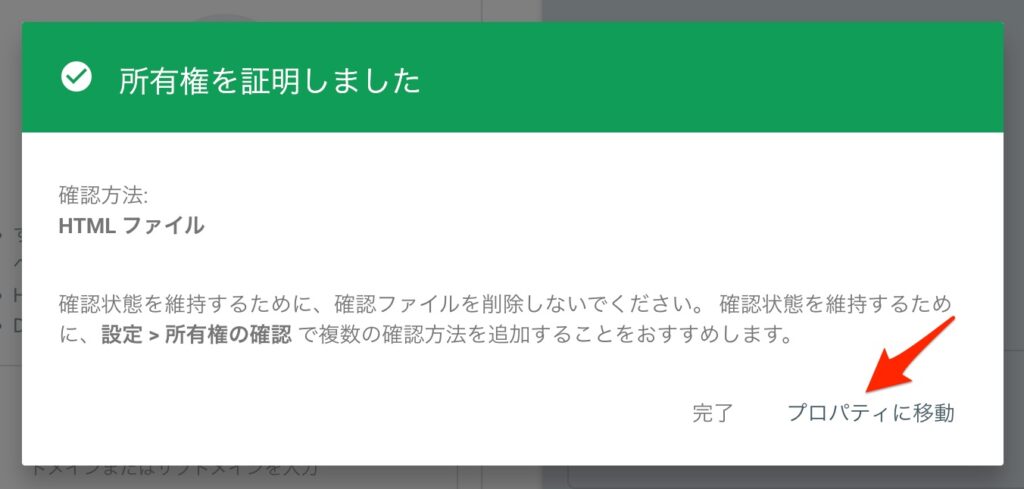 アップロードしたファイルが確認できれば所有権の証明が完了します。プロパティに移動して早速サーチコンソールの画面を確認してみましょう。