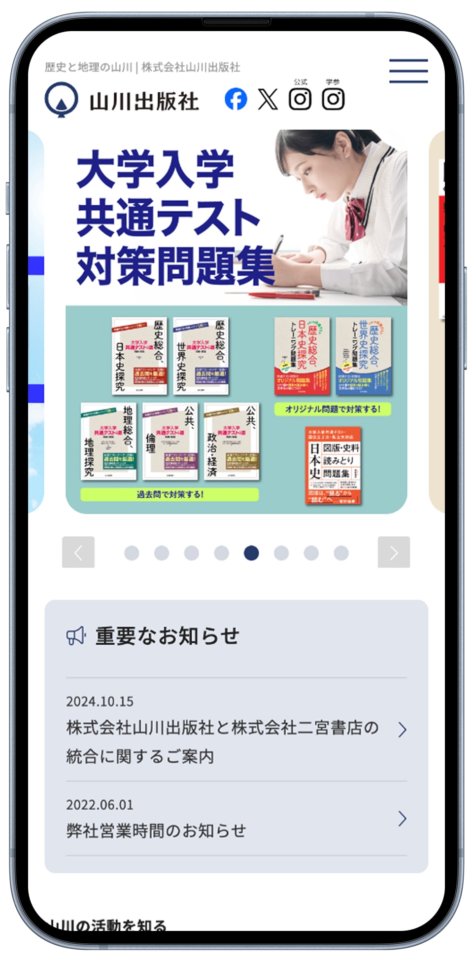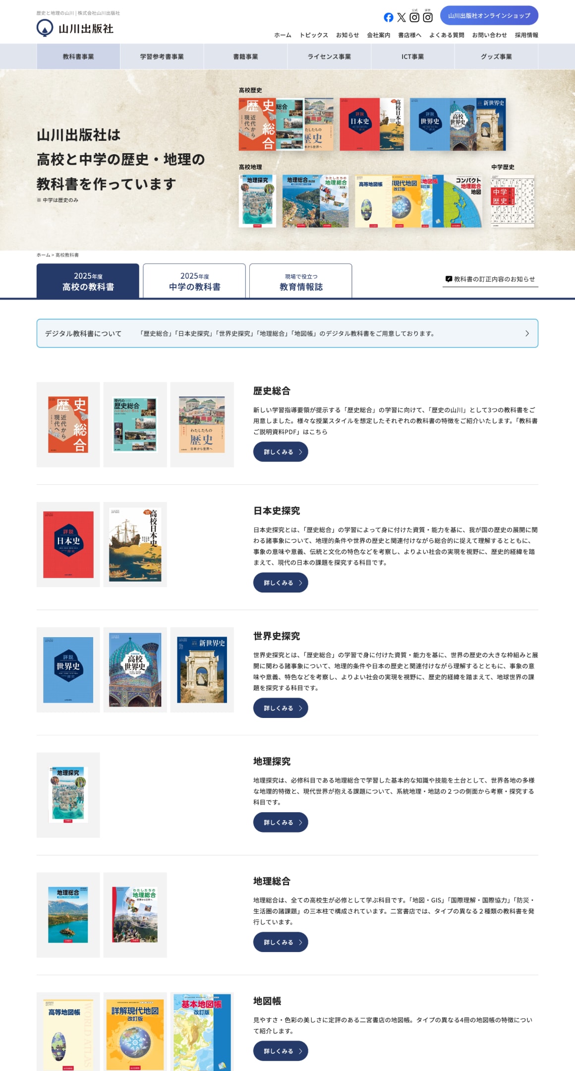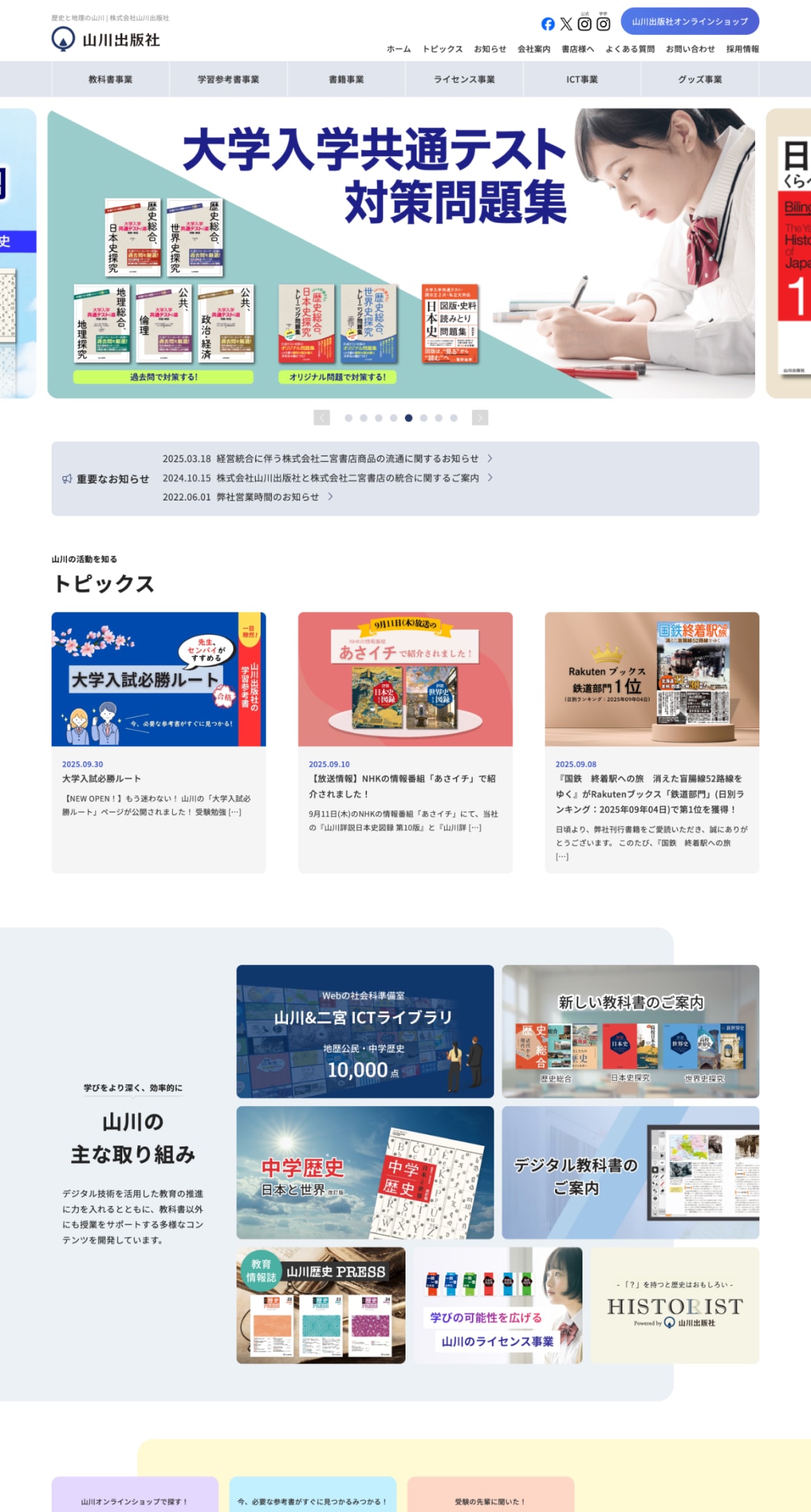 歴史や日本史などの教科書や学習参考書をはじめ一般書まで幅広く出版する山川出版社様のコーポレートサイト+ECサイト。ユーザーは、先生方や生徒さん、一般の方までそれぞれ別々の目的でサイトに訪れます。そのため、各ユーザーに対して適切なコンテンツの配置・動線を設計しなければユーザーが欲しい情報までスムーズにたどり着くことができません。もともと情報量が多いコーポレートサイトということもあり、単なる情報の羅列にならないように、ひとつひとつコンテンツとその目的を整理し、ユーザーが迷わない設計にすることができました。