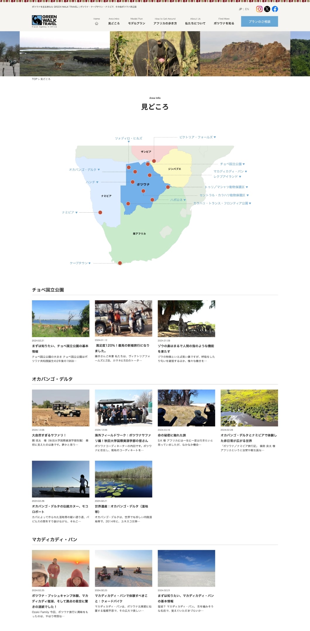 オーダーメイドプランの価値をしっかりと伝え、他の観光情報サイトと差別化を図るためにも、コンセプトの設計から見直し、全体的に再構築することになりました。そのため、言葉選びもより慎重に検討した方がよいと考え、ボツワナ旅行を検討しているお客様がこのサイトを見て胸踊る姿を想像しながら、各所の見出しなどに使う言葉もコンセプトにマッチしたものをご提案しました。また、ユーザーが情報収集しやすいように、マップから各エリアに関する記事一覧に飛べるように工夫をしました。